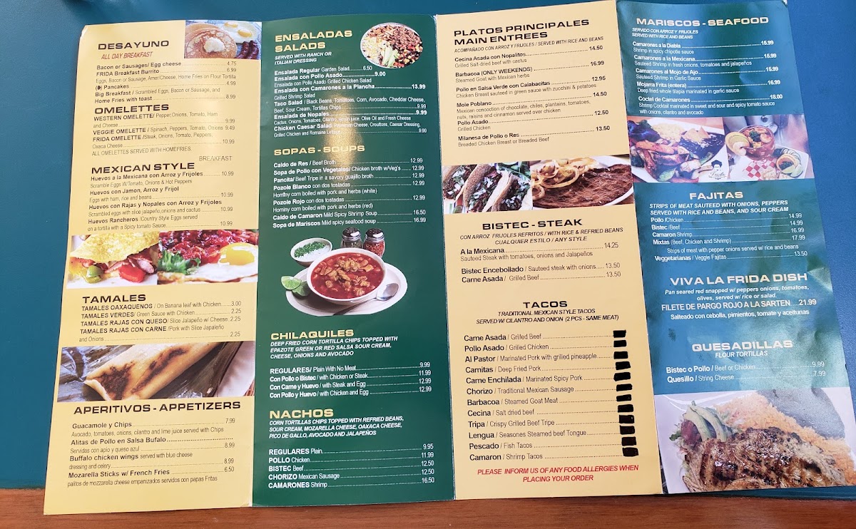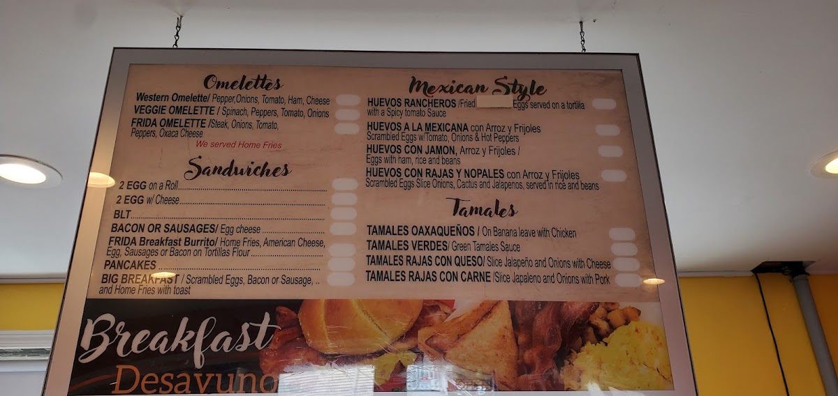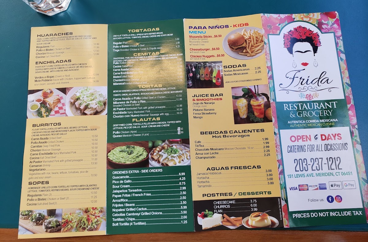 If you're in the mood for a delightful blend of fresh ingredients and bold flavors, Frida Restaurant And Grocery Menu is the place to be. Located at 151 Lewis Ave, Meriden, CT, this spot brings the vibrant tastes of Mexican cuisine right to your table. From hearty tacos to sizzling fajitas, there's something for every palate. Whether you're grabbing a quick bite or enjoying a leisurely meal, you’ll find the perfect combination of savory, spicy, and satisfying dishes. Alongside their delicious meals, the grocery section offers a unique selection of authentic Mexican products, perfect for taking a piece of the flavor home. With every dish crafted to offer a genuine taste of Mexico, it’s clear that Frida’s is all about quality and tradition.